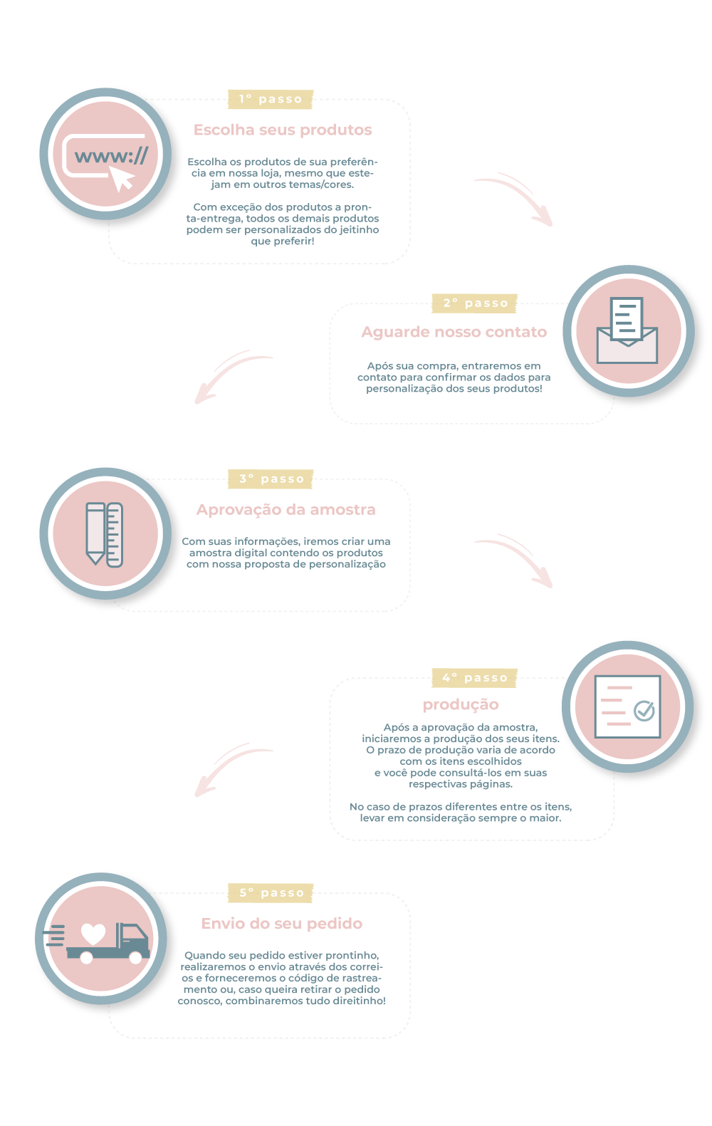 Cada pedido é feito com muito cuidado e carinho, por isso temos um processo especial para garantir que tudo fique exatamente como você sonhou!